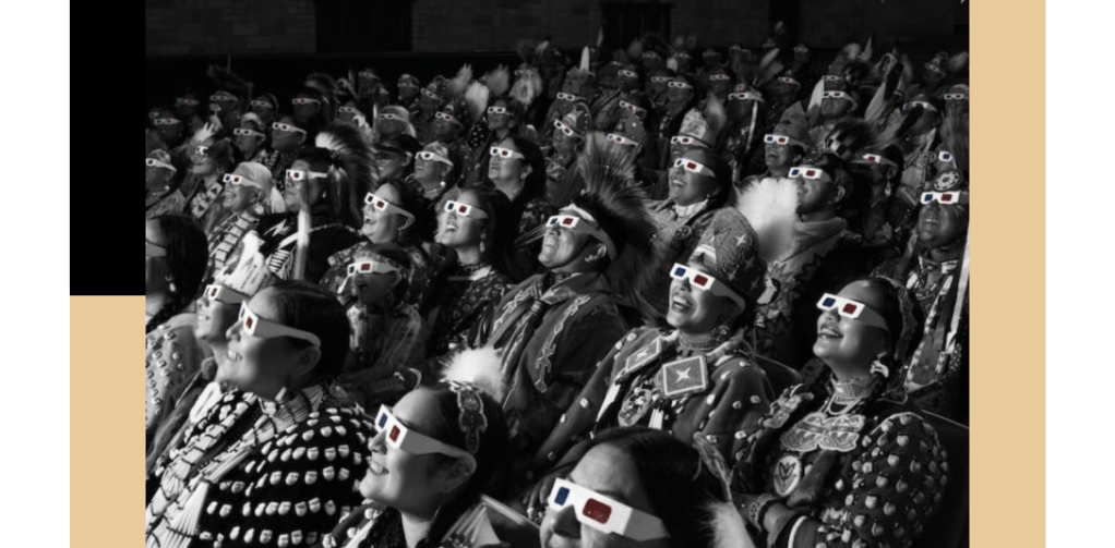 Moving on to music and visual performance, I feel like this concert of A Tribe Called Red is a great start. The duo combines powwow and round dance songs with Electronic Dance Music. The combination has led the way for other Indigenous music artists to gain recognition in a more Western-centered environment. Along with the unique sound that A Tribe Called Red produces, the imagery that accompanies the music solidifies the purposefulness of everything that goes into how they chose to represent Native culture. Shortly into the video, the duo has a grass dancer come out in his tribal clothes and traditionally dances to the EDM. Next we see a Fancy Shawl dancer come out and dance her traditional dance. What is interesting is that later the dancers come out in their street clothes and dances. There is the idea that these two people exist in both worlds. It is almost to say, we are Native people no matter what we are wearing…Like Bobby Wilson says in the 1491s Tedx “I am just as Indian as I stand before you with or without feathers popping out of my head”.